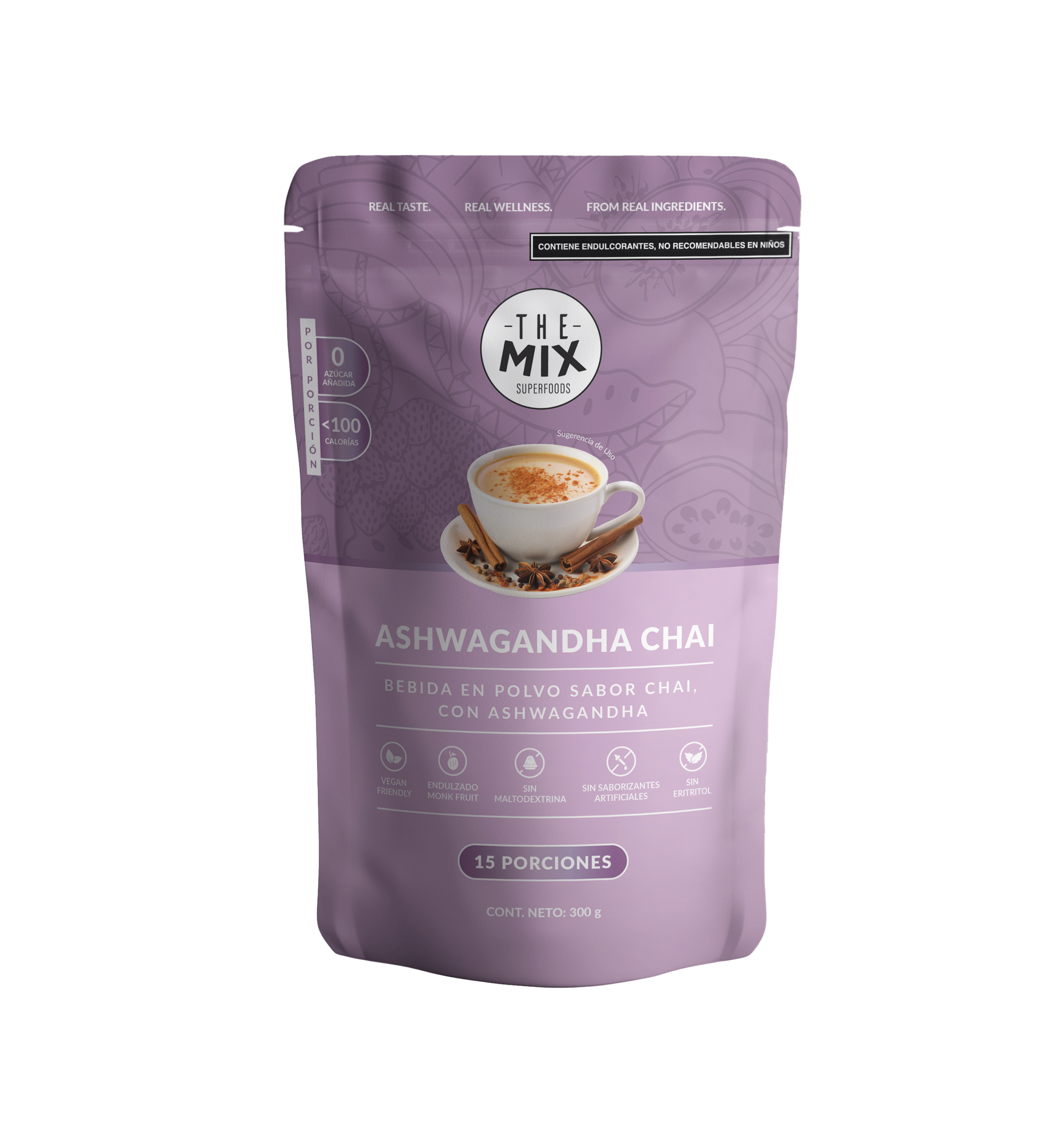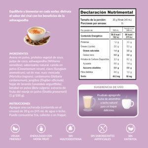 Avena en polvo, proteína vegetal de soya, coco en polvo, ashwagandha (Withania somnifera), saborizante natural, canela en polvo (Cinnamomum verum), clavo (Syzygium aromaticum), sal de mar, nuez moscada (Myristica fragrans), cardamomo (Elettaria cardamomum), jengibre (Zingiber officinale), hojas de lavanda (Lavandula angustifolia), betabel en polvo (Beta vulgaris), extracto de fruto del monje en polvo (Siraitia grosvenorii) (1 g/100 g).