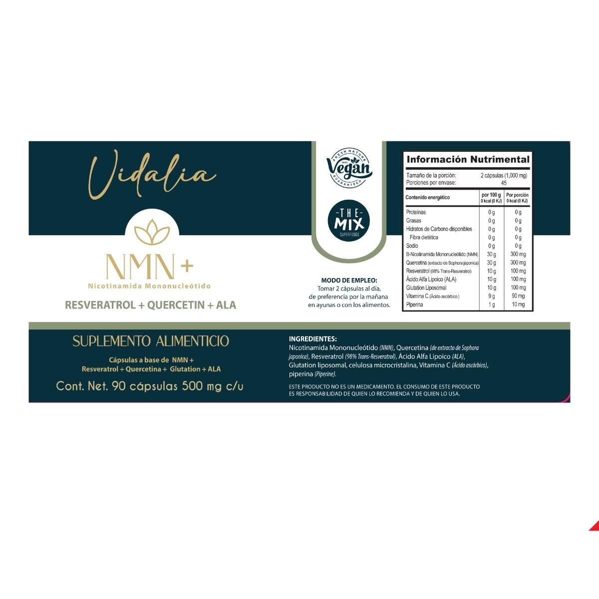 Nicotinamida mononucleótido (NMN), quercetina (de extracto de Sophora japonica), resveratrol (98% trans-resveratrol), ácido alfa lipoico (ALA), glutatión liposomal, vitamina C (ácido ascórbico), piperina (de Piper nigrum), cápsula vegetal (hidroxipropilmetilcelulosa), celulosa microcristalina.